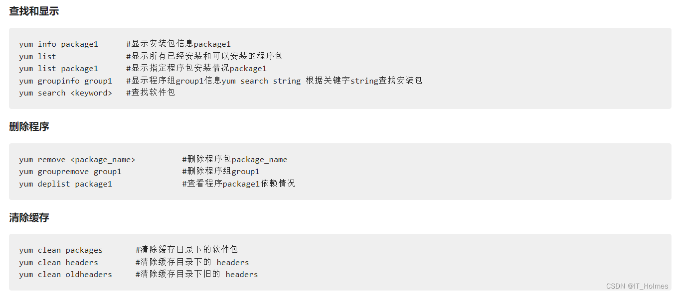 yum 命令 基于 RPM 包管理,能够从指定的服务器自动下载 RPM 包并且安装,可以自动处理依赖性关系,并且一次安装所有依赖的软件包,无须繁琐地一次次下载、安装。
