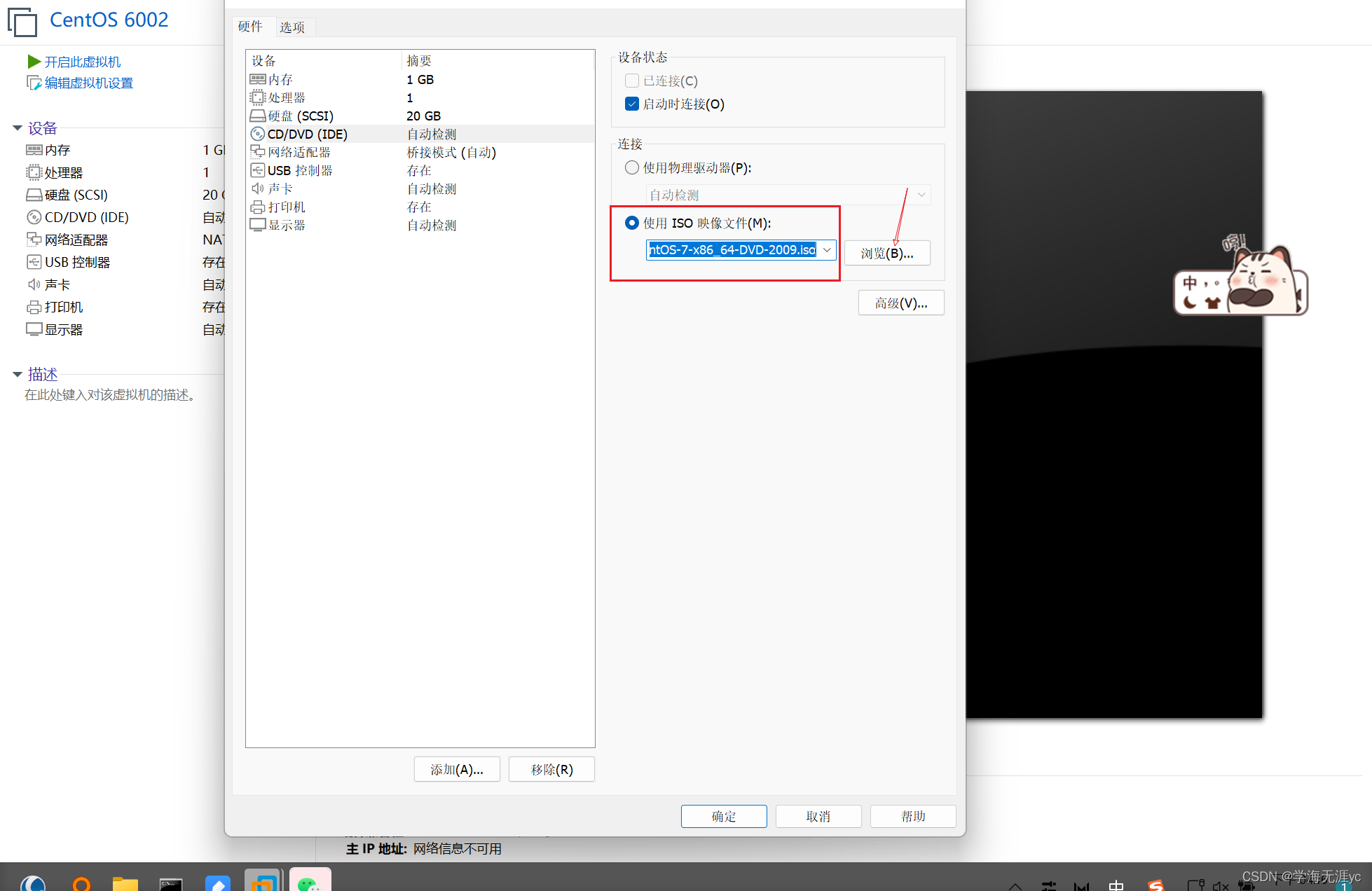8.进去之后选择DVD勾选使用ISO映像文件,浏览把之前下载好的镜像找到放进去