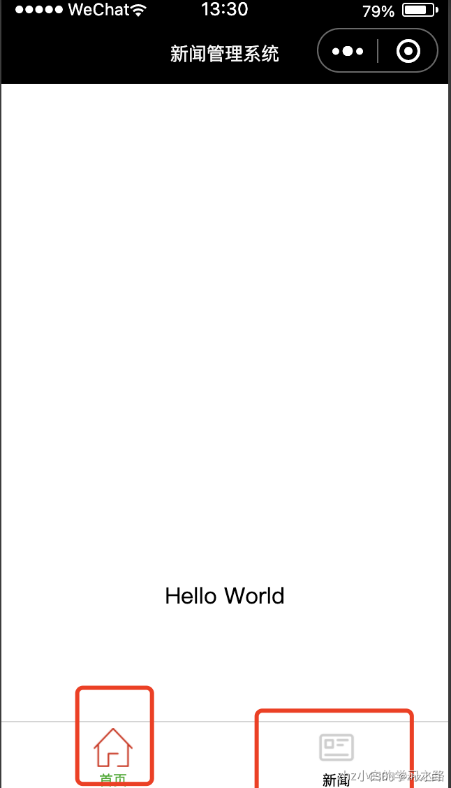 "tabBar": { "list": [{ "pagePath": "pages/index/index", "text": "首页", "iconPath":"./images/home.png", "selectedIconPath":"./images/home_select.png" }, { "pagePath": "pages/info/info", "text": "新闻", "iconPath": "./images/news.png", "selectedIconPath": "./images/news_select.png" }] } 展示效果: