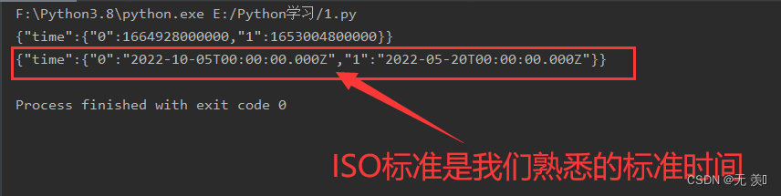 import pandas as pdimport datetimedata = {'time': [datetime.date.today(), datetime.date(2022, 5, 20)]}df = pd.DataFrame(data)print(df.to_json(date_format='epoch'))print(df.to_json(date_format='iso')) 运行结果: