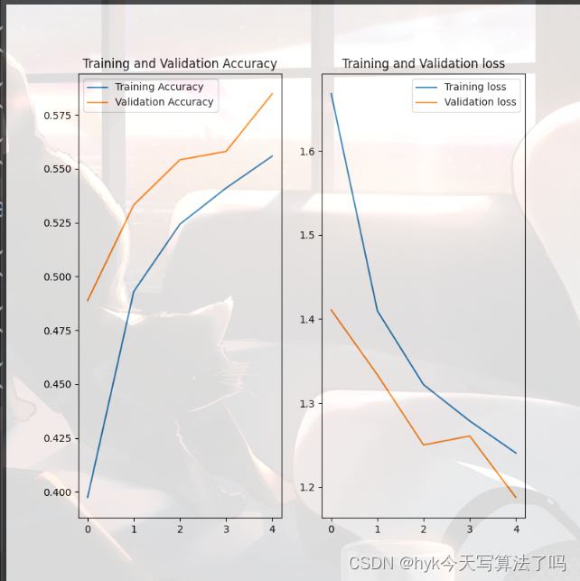 import tensorflow as tfimport numpy as npfrom matplotlib import pyplot as pltnp.set_printoptions(threshold=np.inf)cifar10 = tf.keras.datasets.cifar10(x_train, y_train), (x_test, y_test) = cifar10.load_data()x_train, x_test = x_train / 255.0, x_test / 255.0class Baseline(tf.keras.Model): def __init__(self): super(Baseline, self).__init__() self.c1 = tf.keras.layers.Conv2D(filters=6, kernel_size=(5, 5), padding='same') self.b1 = tf.keras.layers.BatchNormalization() self.a1 = tf.keras.layers.Activation('relu') self.p1 = tf.keras.layers.MaxPool2D(pool_size=(2, 2), strides=2, padding='same') self.d1 = tf.keras.layers.Dropout(0.2) self.flatten = tf.keras.layers.Flatten() self.f1 = tf.keras.layers.Dense(128, activation='relu') self.d2 = tf.keras.layers.Dropout(0.2) self.f2 = tf.keras.layers.Dense(10, activation='softmax') def call(self, inputs): x = self.c1(inputs) x = self.b1(x) x = self.a1(x) x = self.p1(x) x = self.d1(x) x = self.flatten(x) x = self.f1(x) x = self.d2(x) y = self.f2(x) return ymodel = Baseline()model.compile(optimizer=tf.keras.optimizers.Adam(), loss=tf.keras.losses.SparseCategoricalCrossentropy(from_logits=False), metrics=[tf.keras.metrics.sparse_categorical_accuracy])history = model.fit(x_train, y_train, batch_size=32, epochs=5, validation_data=(x_test, y_test), validation_freq=1)model.summary()# showacc = history.history['sparse_categorical_accuracy']val_acc = history.history['val_sparse_categorical_accuracy']loss = history.history['loss']val_loss = history.history['val_loss']print(acc)print(val_loss)plt.figure(figsize=(8, 8))plt.subplot(1, 2, 1)plt.plot(acc, label='Training Accuracy')plt.plot(val_acc, label='Validation Accuracy')plt.title('Training and Validation Accuracy')plt.legend()plt.subplot(1, 2, 2)plt.plot(loss, label='Training loss')plt.plot(val_loss, label='Validation loss')plt.title('Training and Validation loss')plt.legend()plt.show() 运行结果