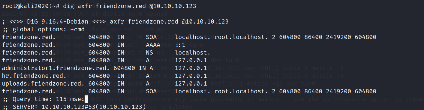 因为我们前面扫描的时候发现了53端口是开着一个dns服务的,所以尝试使用friendzoneportal.red进行axfr,它的具体含义简单来说就是使用dig命令向服务器发送一个axfr的请求,如果服务器支持axfr,那么就会把请求的域对应的所有的dns记录都返回给请求者。