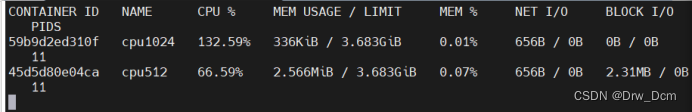 docker run -tid --name cpu512 --cpu-shares 512 centos:stress stress -c 10 容器产生10个子函数进程docker exec -it f4953c0d7e76 bash 进入容器使用top查看cpu使用情况再开启一个容器做比较docker run -tid --name cpu1024 --cpu-shares 1024 centos:stress stress -c 10docker exec -it 5590c57d27b0 bash //进容器使用top对比两个容器的%CPU,比例是1:2docker stats 查看资源使用