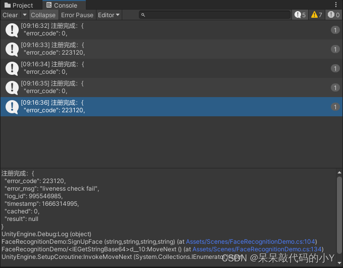 // 人脸注册public void SignUpFace(string image, string imageType, string groupId, string userId){var options = new Dictionary<string, object>{{"user_info", "user's info"},{"quality_control", "NORMAL"},{"liveness_control", "LOW"}};// 带参数调用人脸注册var result = client.UserAdd(image, imageType, groupId, userId, options);Debug.Log(result);} 2.5 注册人脸 上传到 百度大脑人脸识别库