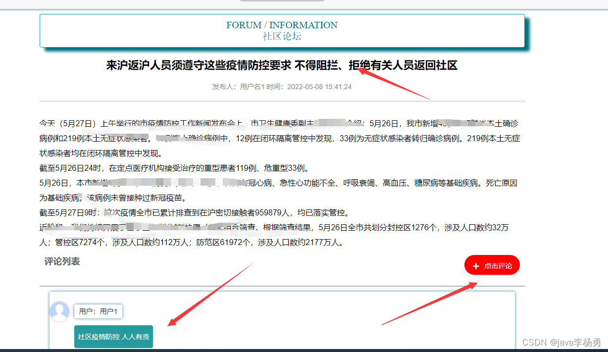 点击查看社区论坛列表和详情,用户登录后可以添加社区论坛信息,可以进行论坛信息进行评论等操作。