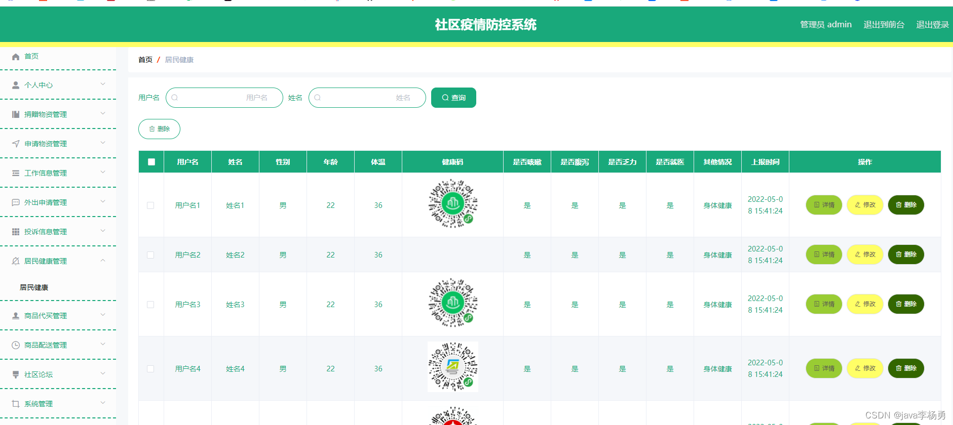 在体温上报管理页面可以对用户姓名、姓名、性别、年龄、体温、健康码、是否咳嗽、是否腹泻、是否乏力、是否就医、其他情况、上报时间等信息进行详情,修改或删除等操作。