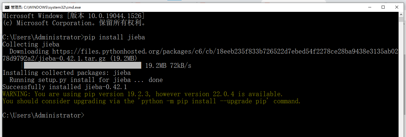 点击windows+r,进入命令提示符输入cmd,进入界面后,输入pip install jieba。即可安装,示例如下: