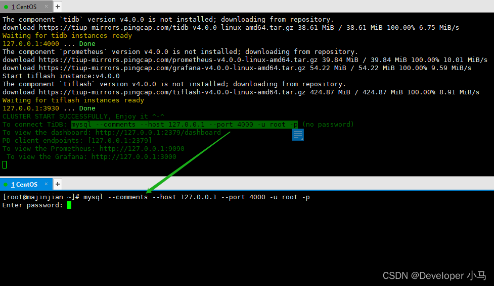 tiup playground v4.0.0 --kv 1 --pd 1 --db 1 --monitor 首次启动时,需要下载一些新的东西所以速度稍慢。出现绿色代码即启动成功,且处于启动状态;