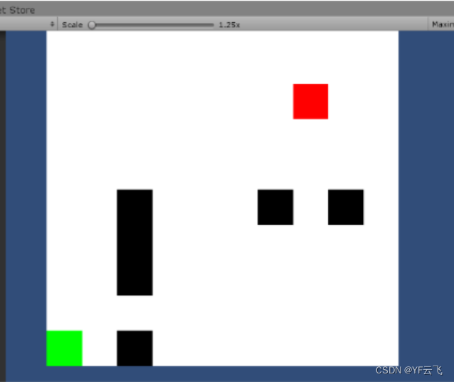 using System.Collections;using System.Collections.Generic;using UnityEngine;public class AStar : MonoBehaviour{ public const int width = 10; public const int height = 10; public Point[,] map = new Point[height,width]; public SpriteRenderer[,] sprites = new SpriteRenderer[height, width];//图片和结点一一对应 public GameObject prefab; //代表结点的图片 public Point start; public Point end; void Start() { InitMap(); //测试代码 AddObstacle(2, 4); AddObstacle(2, 3); AddObstacle(2, 2); AddObstacle(2, 0); AddObstacle(6, 4); AddObstacle(8, 4); SetStartAndEnd(0, 0, 7, 7); FindPath(); ShowPath(); } public void InitMap()//初始化地图 { for(int i=0;i<width;i++) { for (int j = 0; j < height; j++) { sprites[i, j] = Instantiate(prefab, new Vector3(i, j, 0),Quaternion.identity).GetComponent<SpriteRenderer>(); map[i, j] = new Point(i, j); } } } public void AddObstacle(int x,int y)//添加障碍 { map[x, y].isObstacle = true; sprites[x, y].color = Color.black; } public void SetStartAndEnd(int startX,int startY,int endX,int endY)//设置起点和终点 { start = map[startX,startY]; sprites[startX, startY].color = Color.green; end = map[endX, endY]; sprites[endX, endY].color = Color.red; } public void ShowPath()//显示路径 { Point temp = end.parent; while(temp!=start) { sprites[temp.X, temp.Y].color = Color.gray; temp = temp.parent; } } public void FindPath() { List<Point> openList = new List<Point>(); List<Point> closeList = new List<Point>(); openList.Add(start); while(openList.Count>0)//只要开放列表还存在元素就继续 { Point point = GetMinFOfList(openList);//选出open集合中F值最小的点 openList.Remove(point); closeList.Add(point); List<Point> SurroundPoints = GetSurroundPoint(point.X,point.Y); foreach(Point p in closeList)//在周围点中把已经在关闭列表的点删除 { if(SurroundPoints.Contains(p)) { SurroundPoints.Remove(p); } } foreach (Point p in SurroundPoints)//遍历周围的点 { if (openList.Contains(p))//周围点已经在开放列表中 { //重新计算G,如果比原来的G更小,就更改这个点的父亲 int newG = 1 + point.G; if(newG<p.G) { p.SetParent(point, newG); } } else { //设置父亲和F并加入开放列表 p.parent = point; GetF(p); openList.Add(p); } } if (openList.Contains(end))//只要出现终点就结束 { break; } } } public List<Point> GetSurroundPoint(int x,int y)//得到一个点周围的点 { List<Point> PointList = new List<Point>(); if(x>0&&!map[x-1,y].isObstacle) { PointList.Add(map[x - 1, y]); } if(y>0 && !map[x , y-1].isObstacle) { PointList.Add(map[x, y - 1]); } if(x<height-1 && !map[x + 1, y].isObstacle) { PointList.Add(map[x + 1, y]); } if(y<width-1 && !map[x , y+1].isObstacle) { PointList.Add(map[x, y + 1]); } return PointList; } public void GetF(Point point)//计算某个点的F值 { int G = 0; int H = Mathf.Abs(end.X - point.X) + Mathf.Abs(end.Y - point.Y); if(point.parent!=null) { G = 1 + point.parent.G; } int F = H + G; point.H = H; point.G = G; point.F = F; } public Point GetMinFOfList(List<Point> list)//得到一个集合中F值最小的点 { int min = int.MaxValue; Point point = null; foreach(Point p in list) { if(p.F<min) { min = p.F; point = p; } } return point; }} 上面是 A* 算法的代码,这里使用了一张 100x100 像素的图片代表每一个结点,修改它们的颜色用来表示起点、终点、障碍和路径。在这里我计算的方式是每移动一个格子代价为 1,所以起点的 G 值为 0,每次遍历把 G+1,H 则是当前结点和终点在 x 轴和 y 轴上的差之和。