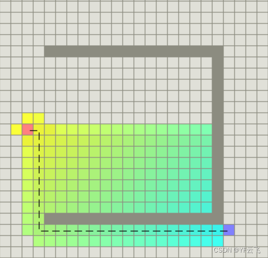 在上图中,黄色点(h)表示远离目标的顶点,蓝绿色点(g)表示远离起点的顶点。