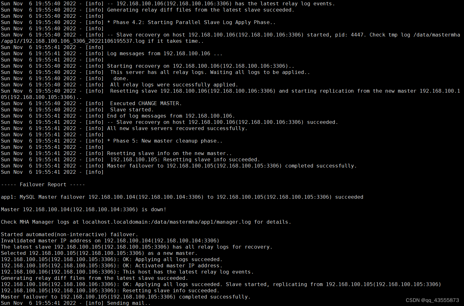 通过查看日志可以看到主节点(192.168.100.104)已经切换为(192.168.100.105)