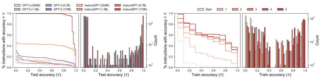 随着模型大小的增加,proposal 质量如何变化?为了解模型大小如何影响初始 proposal 分布的质量,本文研究了 8 个不同的模型。为每个模型生成 250 个指令,并在 50 个测试数据上计算执行准确率,从而评估 proposal 分布的质量。我们在下图 (a) 中可视化了一个简单任务的生存函数(测试准确率大于某个阈值的指令所占百分比)和测试准确率直方图。正如两图所示,较大的模型往往比较小的产生更好的 proposal 分布,经过微调而遵循人类指令的模型也是如此。在简单任务中,由最佳模型 InstructGPT 生成的所有指令都具有合理的测试准确率,与此形成鲜明对比的是,有一半的指令偏离了主题,在执行准确率上表现不佳。