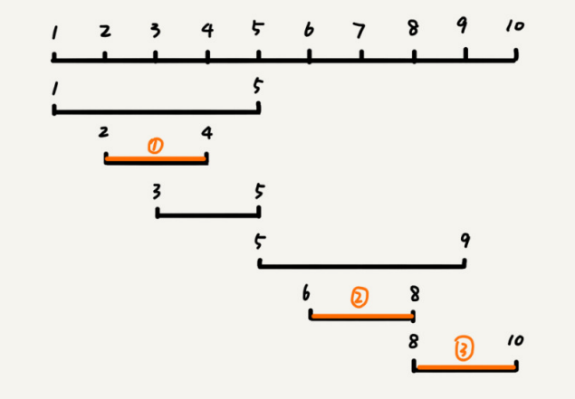 这个问题的处理思路稍微不是那么好懂,不过,我建议你最好能弄懂,因为这个处理思想在 很多贪心算法问题中都有用到,比如任务调度、教师排课等等问题。 这个问题的解决思路是这样的:我们假设这 n 个区间中最左端点是 lmin,最右端点是 rmax。这个问题就相当于,我们选择几个不相交的区间,从左到右将 [lmin, rmax] 覆盖 上。我们按照起始端点从小到大的顺序对这 n 个区间排序。 我们每次选择的时候,左端点跟前面的已经覆盖的区间不重合的,右端点又尽量小的,这样 可以让剩下的未覆盖区间尽可能的大,就可以放置更多的区间。这实际上就是一种贪心的选择方法