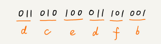 假设通过统计分析发现,这1000个字符中只包含六种不同的字符,假设分别是a,b,c,d,e,f。而三个二进制位(bit)就可以表示8个不同的字符,因此为了减少存储空间,每个字符用三个二进制位来表示:a为000,b为001,c为010,d为011,e为100,f为101。那么,存储这1000个字符只需要3000bit,比原来存储方式节省了很多空间。还有没有更加节省空间的方式呢?