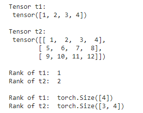# 导入 torchimport torch# 创建张量t1=torch.tensor([1, 2, 3, 4])t2=torch.tensor([[1, 2, 3, 4],[5, 6, 7, 8],[9, 10, 11, 12]])# 打印张量:print("Tensor t1: \n", t1)print("\nTensor t2: \n", t2)# 张量的秩print("\nRank of t1: ", len(t1.shape))print("Rank of t2: ", len(t2.shape))# 张量的形状print("\nRank of t1: ", t1.shape)print("Rank of t2: ", t2.shape) 输出: