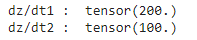 # 导入 torchimport torch# 创建张量t1=torch.tensor(1.0, requires_grad = True)t2=torch.tensor(2.0, requires_grad = True)# 创建变量和渐变z=100 * t1 * t2z.backward()# 打印渐变print("dz/dt1 : ", t1.grad.data)print("dz/dt2 : ", t2.grad.data) 输出: