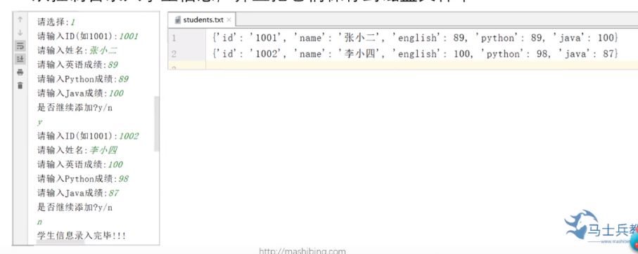def insert():#插入 student_lst=[]#声明一个列表,用于存储学生信息 while True: id=input('请输入id(如1001):') if not id:#如果输入为空,那么id的值为False,就进入不了循环,所以加一个not即可判断是否为空 break name=input('请输入名字(如张三):') if not name: break try: english=int(input('请输入英语成绩:')) python = int(input('请输入python成绩:')) java = int(input('请输入java成绩:')) except: print('您输入的有误,请重新输入') continue #将录入的学生信息保存到字典中 student={'id':id,'name':name,'english':english,'python':python,'java':java} student_lst.append(student) answer=input('是否继续添加?y/n') if answer=='y': continue else: break #调用save()函数 save(student_lst) print('学生信息完毕!!!') def save(lst): try: stu_text=open(filename,'a',encoding='utf-8')#打开文件,以追加的形式 except: stu_text=open(filename,'w',encoding='utf-8')#以只写的形式打开文件 for item in lst: stu_text.write(str(item)+'\n') stu_text.close()
