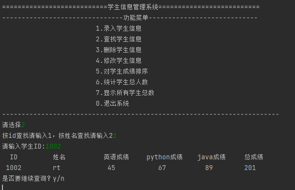 def search(): student_query=[]#声明一个列表 while True: id='' name='' if os.path.exists(filename):#判断文件是否存在 mode=input('按id查找请输入1,按姓名查找请输入2') if mode=='1': id=input('请输入学生ID:') elif mode=='2': name=input('请输入学生姓名:') else: print('您的输入有误,请重新输入') search() with open(filename,'r',encoding='utf-8') as rfile:#以只读的方式打开 student=rfile.readlines()#获取全部的内容存入列表中 for item in student:#遍历列表存入字典中 d=dict(eval(item)) if id!='':#因为有两种查询方式,再加上最开始默认值为0,所以进行判断用哪种方式 if d['id']==id: student_query.append(d)#如果查询的id在字典中,则将内容添加到新的列表中 elif name!='': if d['name']==name: student_query.append(d)#如果查询到name在字典中,则将内容添加到新的列表中 #显示查询结果 show_student(student_query)#展现新的列表,需要格式化输出 #清空列表 student_query.clear() answer=input('是否要继续查询?y/n\n') if answer=='y': continue else: break else: print('暂未保存学生信息') return def show_student(lst): if len(lst)==0: print('没有查询到学生信息,无数据显示!!!') return #定义标题的显示格式 format_title='{:^6}\t{:^12}\t{:^8}\t{:^10}\t{:^10}\t{:^8}' print(format_title.format('ID','姓名','英语成绩','python成绩','java成绩','总成绩')) #定义内容的显示格式 format_data='{:^6}\t{:^12}\t{:^8}\t{:^10}\t{:^10}\t{:^8}' for item in lst: print(format_data.format(item.get('id'), item.get('name'), item.get('englist'), item.get('python'), item.get('java'), int(item.get('englist'))+int(item.get('python'))+int(item.get('java')) ))