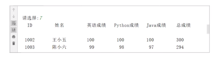 def show(): studetn_lst=[] if os.path.exists(filename): with open(filename,'r',encoding='utf-8') as rfile: students=rfile.readlines() for item in students: studetn_lst.append(eval(item)) if studetn_lst: show_student(studetn_lst) def show_student(lst): if len(lst)==0: print('没有查询到学生信息,无数据显示!!!') return #定义标题的显示格式 format_title='{:^6}\t{:^12}\t{:^8}\t{:^10}\t{:^10}\t{:^8}' print(format_title.format('ID','姓名','英语成绩','python成绩','java成绩','总成绩')) #定义内容的显示格式 format_data='{:^6}\t{:^12}\t{:^8}\t{:^10}\t{:^10}\t{:^8}' for item in lst: print(format_data.format(item.get('id'), item.get('name'), item.get('englist'), item.get('python'), item.get('java'), int(item.get('englist'))+int(item.get('python'))+int(item.get('java')) ))
