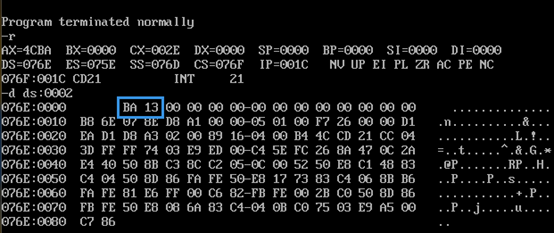 DATAS SEGMENT ;此处输入数据段代码 NUM DW 100 SUM DD ?DATAS ENDSSTACKS SEGMENT ;此处输入堆栈段代码STACKS ENDSCODES SEGMENT ASSUME CS:CODES,DS:DATAS,SS:STACKSSTART: MOV AX,DATAS MOV DS,AX ;此处输入代码段代码 MOV AX,NUM ADD AX,1 ;AX=N+1 MUL NUM ;DX.AX=(1+N)*N SHR DX,1 ;32位逻辑右移一位,相当于/2 RCR AX,1 ;DX.AX=DX.AX/2 MOV WORD PTR SUM,AX MOV WORD PTR SUM+2,DX ;按小端方式保存 MOV AH,4CH INT 21HCODES ENDS END START 3.3 代码分析