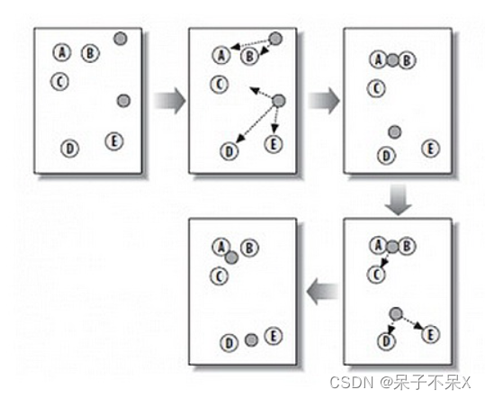 从上图中,我们可以看到,A,B,C,D,E是五个在图中点。而灰色的点是我们的种子点,也就是我们用来找点群的点。有两个种子点,所以K=2。