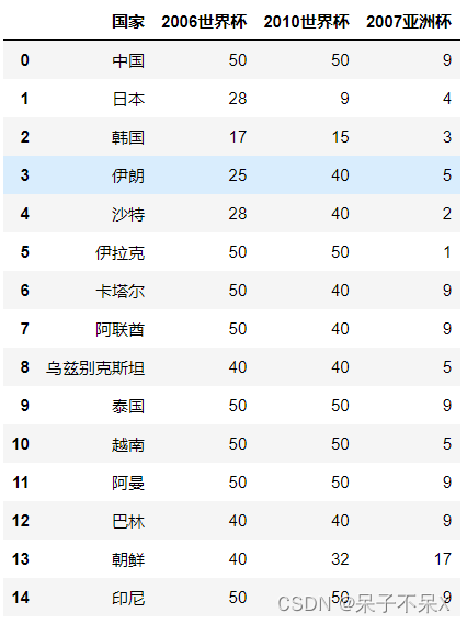 football.columns = ["国家","2006世界杯","2010世界杯","2007亚洲杯"]football