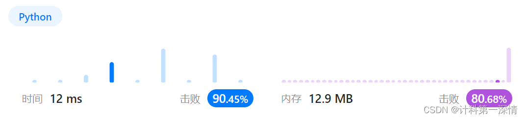 def climbStairs(self, n): dp = [0 for _ in range(n+1)] # 两个特殊情况处理一下 if n==1: return 1 if n== 2: return 2 dp[1],dp[2] = 1,2 for i in range(3,n+1): # i - 1:这次爬一个台阶 # i - 2:这次爬两个台阶 dp[i] = dp[i-1] + dp[i-2] return dp[-1] 四、效率总结