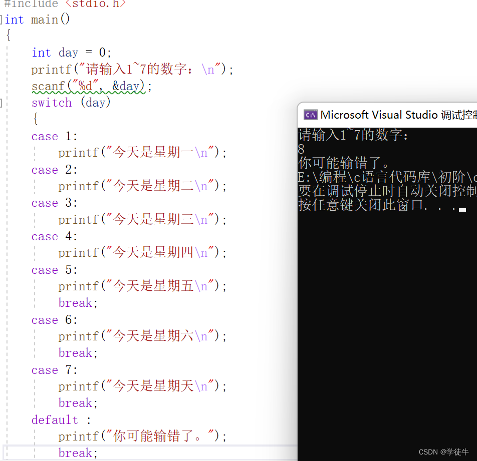 #include <stdio.h>int main(){int day = 0;printf("请输入1~7的数字:\n");scanf("%d", &day);//输入目标”门牌号“switch (day)//目标”门牌号“{case 1:printf("今天是星期一\n");break;case 2:printf("今天是星期二");break;case 3:printf("今天是星期三");break;case 4:printf("今天是星期四");break;case 5:printf("今天是星期五");break;case 6:printf("今天是星期六");break;case 7:printf("今天是星期天");break;}return 0;} 2.3 break语句在switch语句中的作用: