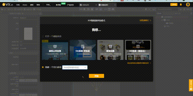 首先我们需要找到ivx编辑器,然后选择你所需要的场景。这里可以开发web网页版、小程序(微信,支付宝),H5,原生Android以及IOS等等,可以说功能非常的全,面很广。最后,我们选择默认的方式创建,进入项目后我们在右上角部位修改刚刚创建的应用的名字,当然,然后保存。当然,如果你进来之前就创建好名字了,不想重新改名字,那么直接进入下一步骤就可以了。