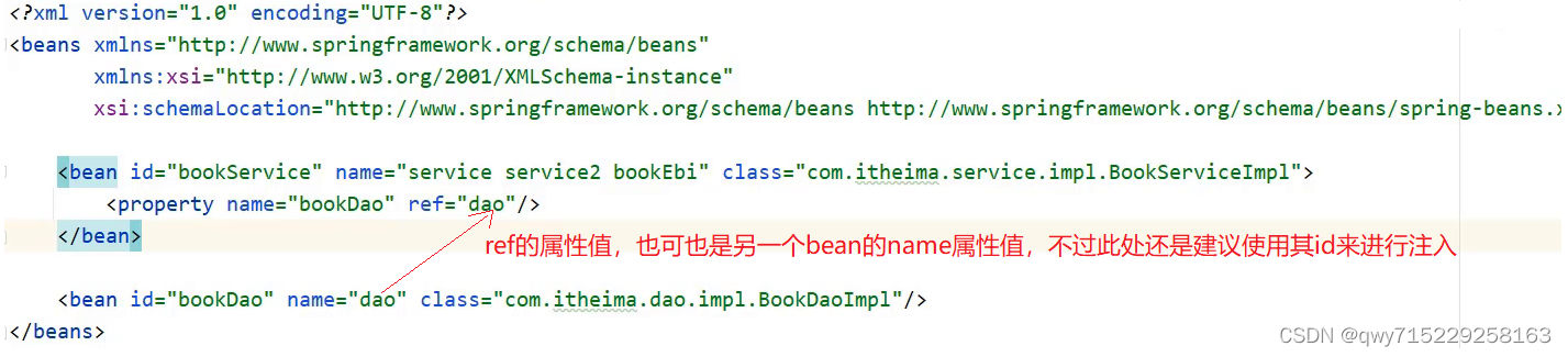 <?xml version="1.0" encoding="UTF-8"?><beans xmlns="http://www.springframework.org/schema/beans" xmlns:xsi="http://www.w3.org/2001/XMLSchema-instance" xsi:schemaLocation="http://www.springframework.org/schema/beans http://www.springframework.org/schema/beans/spring-beans.xsd"> <bean id="bookDao" class="com.itheima.dao.impl.BookDaoImpl"/> <bean id="bookService" class="com.itheima.service.impl.BookServiceImpl"> <constructor-arg name="bookDao" ref="bookDao"/> </bean></beans> 说明:
