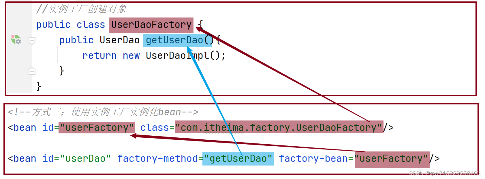 使用对象时,由主动new产生对象转换为由外部提供对象,此过程中对象创建控制权由程序转移到外部,此思想称为控制反转。 业务层要用数据层的类对象,以前是自己new的现在自己不new了,交给别人[外部]来创建对象别人[外部]就反转控制了数据层对象的创建权这种思想就是控制反转别人[外部]指定是什么呢?继续往下学 (2)Spring和IOC之间的关系是什么呢?