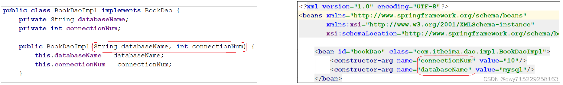 <?xml version="1.0" encoding="UTF-8"?><beans xmlns="http://www.springframework.org/schema/beans" xmlns:xsi="http://www.w3.org/2001/XMLSchema-instance" xsi:schemaLocation="http://www.springframework.org/schema/beans http://www.springframework.org/schema/beans/spring-beans.xsd"> <bean id="bookDao" class="com.itheima.dao.impl.BookDaoImpl"> <constructor-arg name="databaseName" value="mysql"/> <constructor-arg name="connectionNum" value="666"/> </bean> <bean id="userDao" class="com.itheima.dao.impl.UserDaoImpl"/> <bean id="bookService" class="com.itheima.service.impl.BookServiceImpl"> <constructor-arg name="bookDao" ref="bookDao"/> <constructor-arg name="userDao" ref="userDao"/> </bean></beans> **说明:**这两个<contructor-arg>的配置顺序可以任意