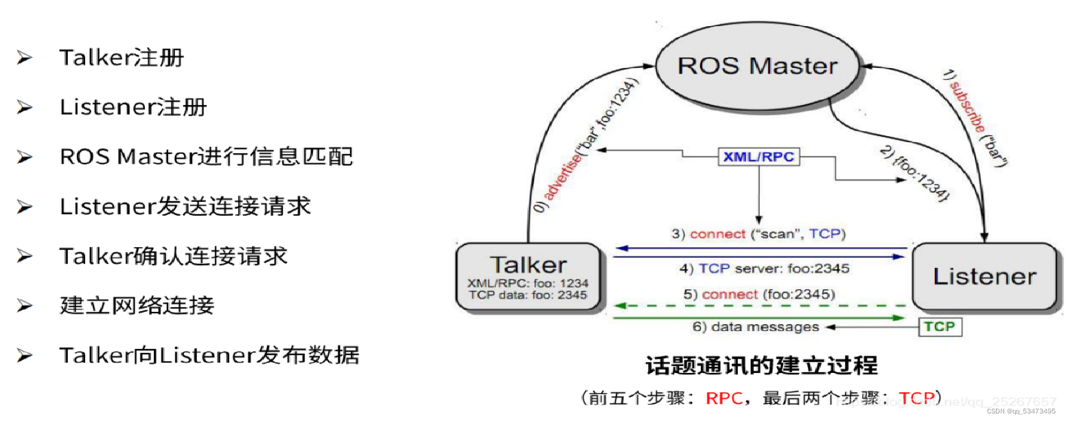 简单的说就是发布方和订阅方现在RosMaster注册,然后RosMaster会帮它们进行匹配,连接,然后双方采取相应的通信协议进行信息的通信