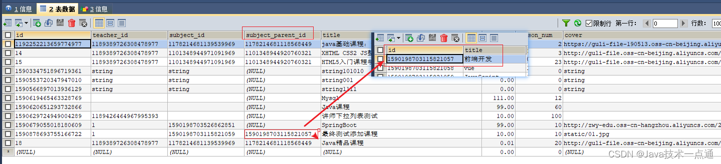@ApiModelProperty(value = "一级分类ID") private String subjectParentId; 重启服务,再次进行测试,添加的课程就有对应的一级分类对应的id值