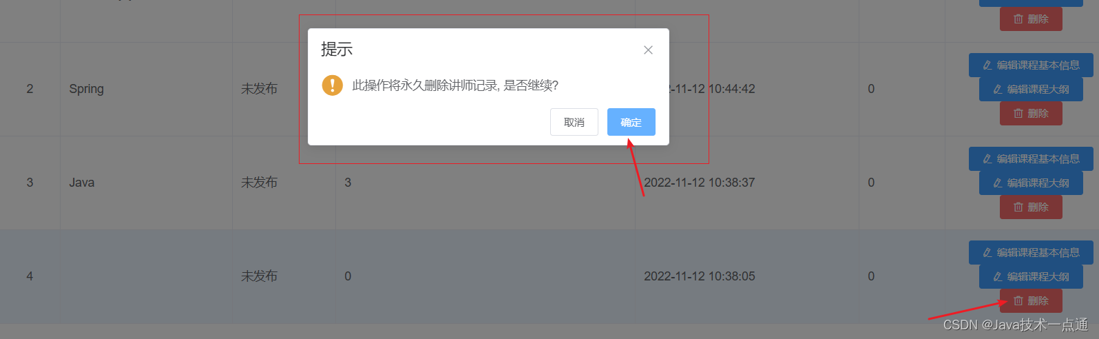 //删除课程的方法 removeDataById(id) { this.$confirm('此操作将永久删除讲师记录, 是否继续?', '提示', { confirmButtonText: '确定', cancelButtonText: '取消', type: 'warning' }).then(() => { //点击确定,执行then方法 //调用删除的方法 course.deleteCourseId(id) .then(response =>{//删除成功 //提示信息 this.$message({ type: 'success', message: '删除成功!' }); //回到列表页面 this.getList() }) }) //点击取消,执行catch方法 } 测试
