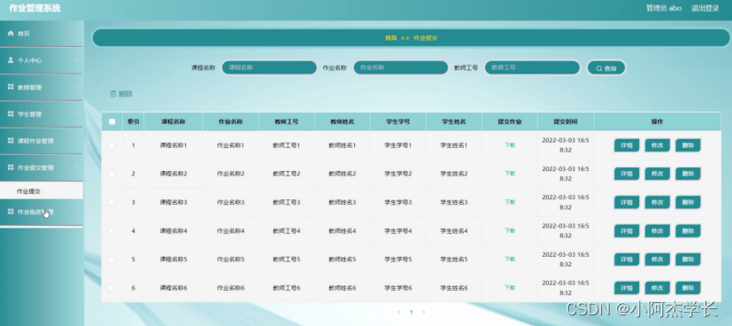 作业提交管理,在作业提交管理页面可以对索引,课程名称,作业名称 ,教师工号,教师姓名,学生学号,学生姓名,提交作业,提交时间等内容进行详情,修改和删除等操作,如图5-9所示。