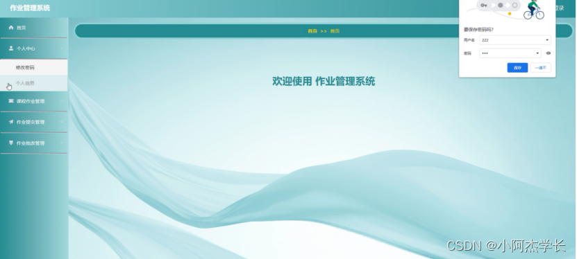管理员登录系统后,可以对首页,个人中心,教师管理,学生管理,课程作业管理 ,作业提交管理,作业批改管理等功能进行相应的操作管理,如图5-4所示。