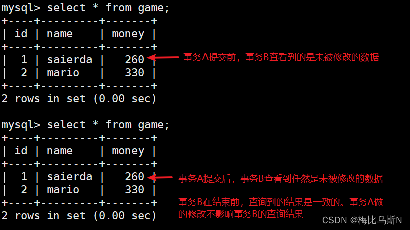 事务B在结束前,查询到的结果是一致的。事务A做的修改不影响事务B的查询结果。