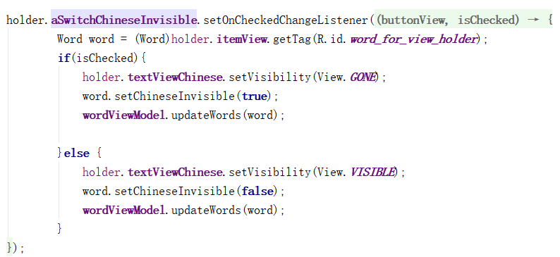 2.在MyAdapter中,监听开关,若发生改变显示/隐藏中文释义,同时修改数据库中ChineseVisible字段的值。