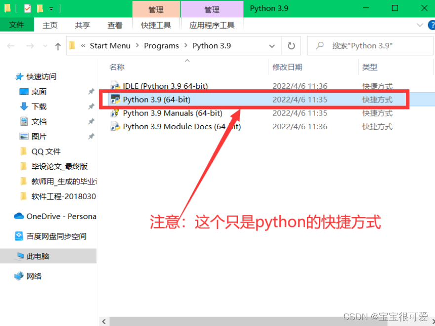此时又遇到难题了,安装好的python路径怎么也找不到了在开始菜单中,找python3.9,但是当我打开文件所在位置后发现,这个也不是安装路径。