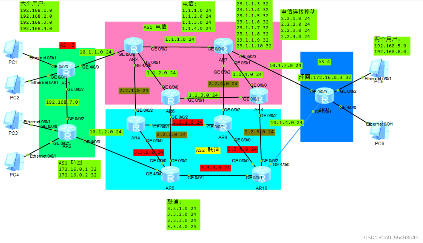 3:PC 1 3 5 属于电信的路由,通信时必须使用电信AS1;PC 2 4 6 属于联通的路由,通信时必须使用联通版的AS2