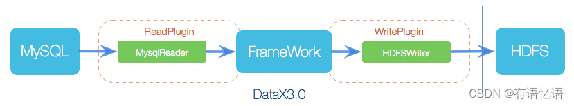 Datax本身作为离线数据同步框架,采用Framework+plugin架构构建。将数据源读取和写入抽象成为Reader/Writer插件,纳入到整个同步框架中。