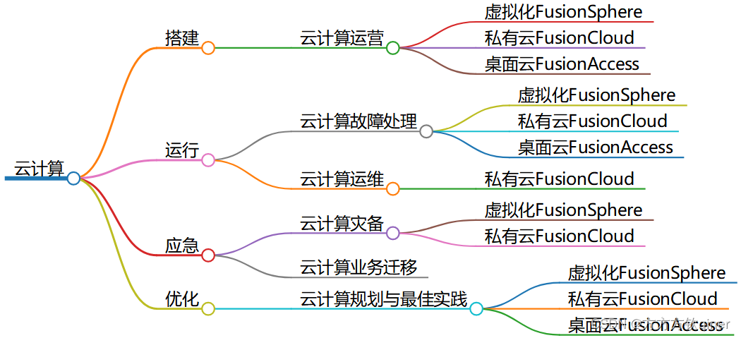 # 云计算## 搭建### 云计算运营## 运行### 云计算运维### 云计算故障处理## 应急### 云计算灾备### 云计算业务迁移## 优化### 云计算规划与最佳实践 接着细分,利用虚拟化FusionSphere、私有云FusionCloud、桌面云FusionAccess三个方向