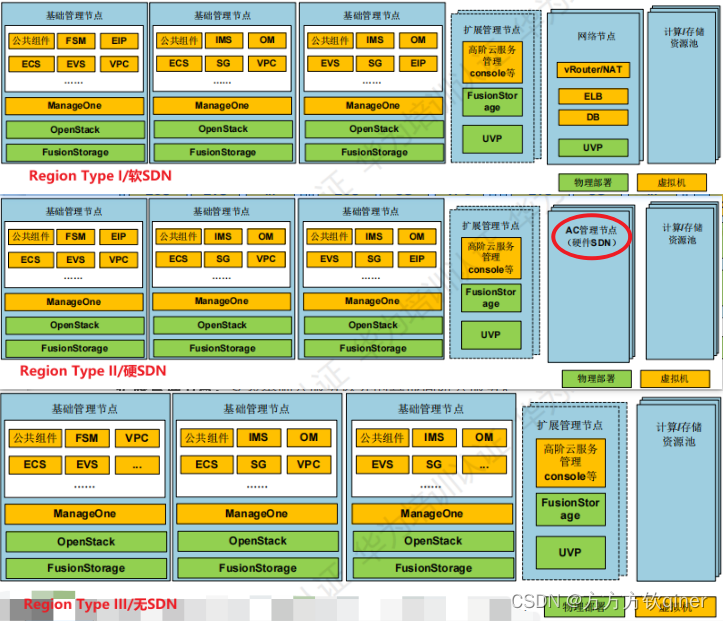 | FusionCloud组件部署方案 | - | Region Type1/软SDN | 网络节点安装软件SDN组件,提供vRouter、ELB、EIP等功能 | |