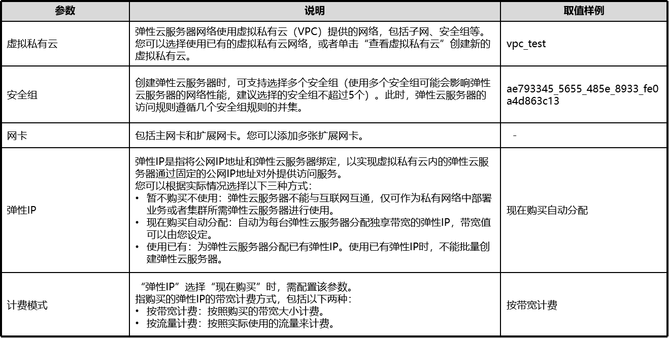 | ECS弹性云服务器创建操作参数配置 | 虚拟私有云 | 弹性云服务器网络使用虚拟私有云(VPC)提供的网络,包括子网、安全组等。您可以选择使用已有的虚拟私有云网络,或者单击“查看虚拟私有云”创建新的虚拟私有云。 | ||