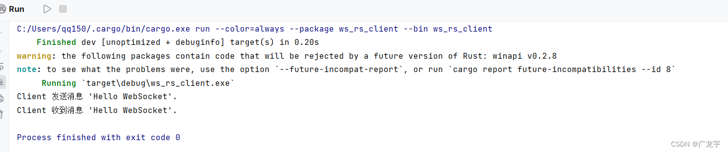 use ws::{connect, CloseCode};fn main() { // 初始化日志 env_logger::init(); // 连接到url并调用闭包 if let Err(error) = connect("ws://127.0.0.1:3012", |out| { // 将WebSocket打开时要发送的消息排队 if out.send("Hello WebSocket").is_err() { println!("Websocket无法初始消息排队") } else { println!("Client 发送消息 'Hello WebSocket'. ") } // 处理程序需要获取out的所有权,因此我们使用move move |msg| { // 处理在此连接上接收的消息 println!("Client got message '{}'. ", msg); // 关闭连接 out.close(CloseCode::Normal) } }) { // 通知用户故障 println!("Failed to create WebSocket due to: {:?}", error); }}