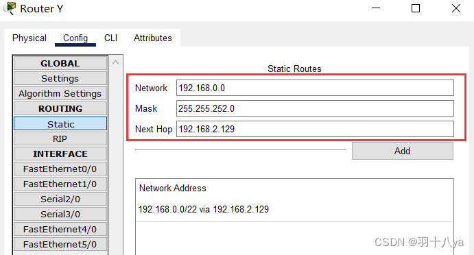 在路由器Y中的配置我们发现,需要配置两次,为了简化路由表,我们采用路由聚合方式