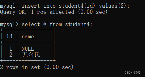 create table student4(id int primary key,name varchar(20) default "无名氏");