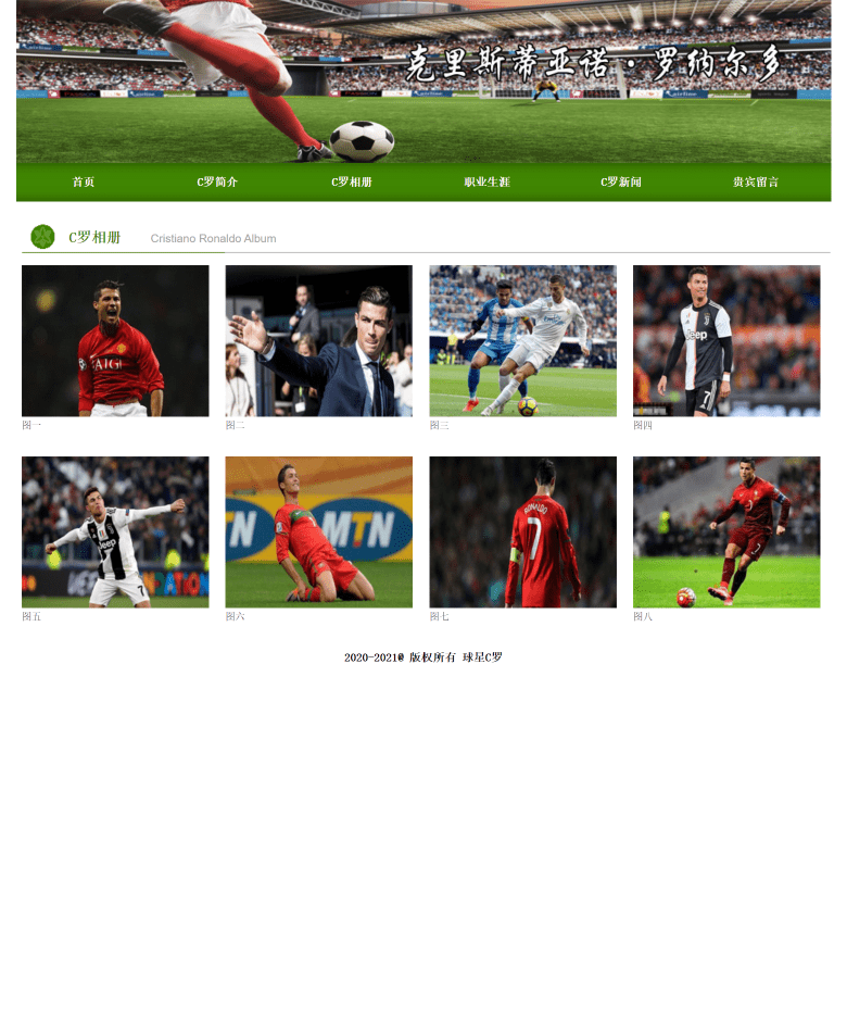 <!DOCTYPE html PUBLIC "-//W3C//DTD XHTML 1.0 Transitional//EN" "http://www.w3.org/TR/xhtml1/DTD/xhtml1-transitional.dtd"><html xmlns="http://www.w3.org/1999/xhtml"><head><meta http-equiv="Content-Type" content="text/html; charset=utf-8" /><title>球星C罗</title><link href="css/style.css" rel="stylesheet" type="text/css" /></head><body><!-----头部开始-------><div class="top"><a href="index.html"><img style="float:left" src="images/logo.jpg" /></a> </div><!---nav开始----><div class="daohang"><div id="nav"><ul><li><a href="index.html">首页</a></li><li><a href="about.html">C罗简介</a></li><li><a href="jingdian.html">C罗相册</a></li><li><a href="minsu.html">职业生涯</a></li><li><a href="techan.html">C罗新闻</a></li><li><a href="liuyan.html">贵宾留言</a></li></ul></div></div><!---nav结束----><!-----banner-------><div class="ban"> <img src="images/banner3.jpg" width="1000" height="335" border="0" /> </div><!-----头部结束-------><!-----main开始-------><div class="main"><div class="box1"><div class="shang-left"><div class="gk-title"><a href="about.html"><h1>C罗简介</h1></a></div><div class="gk"><img src="images/gktu.jpg" /><p> 克里斯蒂亚诺·罗纳尔多,简称C罗,1985年2月5日出生于葡萄牙马德拉岛丰沙尔,职业足球运动员,司职边锋可兼任中锋。现效力于意甲尤文图斯足球俱乐部,并身兼葡萄牙国家队队长。C罗带球速度极快,善于突破和射门,拥有强悍的身体素质,技术非常全面。2019年1月4日,获得环球足球奖最佳球员奖项;6月9日,随队1-0战胜荷兰获得首届欧国联冠军,并获得决赛阶段金靴。</p></div></div><div class="xz"><a href="techan.html"><h1>C罗新闻<span><i> 更多>></i></span></h1></a><a href="tc01.html"><img src="images/tc01.jpg" /></a><a href="tc02.html"><img src="images/tc02.jpg" /></a><a href="#"><img src="images/tc03.jpg" /></a><a href="#"><img src="images/tc04.jpg" /></a></div><div class="shang-right"><div class="count-title"><a href="minsu.html"><h1>职业生涯</h1></a></div><div class="count"><br /><p> C罗出身于葡萄牙著名球队里斯本竞技。2003-04年赛季曼联官方宣布以1,224万英镑转会费买入C罗,取代转会皇家马德里的贝克汉姆成为"7"号球衣的新主人。</p><p> 加入曼联后,C罗主要担任右翼的角色,但也不时参与左路的进攻。他用华丽的脚法及优秀盘带能力,使球迷对他眼前一亮。</p><p> 2009年6月26日,皇家马德里官方确认克里斯蒂亚诺·罗纳尔多将于7月1日以8,000万英镑转会费加盟皇马,年薪高达1,200万欧元。</p><p> 2018年8月19日,在尤文图斯迎战切沃的比赛中,C罗上演意甲首秀.</p></div></div></div><div class="meishi"><div class="yy-title"><a href="jingdian.html"><h1>C罗风采</h1></a></div><div class="ms"><ul><li><img src="images/jd1.jpg" /><p>图一</p></li> <li><img src="images/jd2.jpg" /><p>图二</p></li> <li><img src="images/jd3.jpg" /><p>图三</p></li> <li><img src="images/jd4.jpg" /><p>图四</p></li> <li><img src="images/jd5.jpg" /><p>图五</p></li> </ul></div></div><!-----main结束-------><!-----bottom开始-------><div class="bottom"><p>2020-2021@ 版权所有 球星C罗 </p></div><!-----bottom结束-------></body></html> ?CSS样式代码