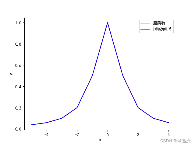 from sympy import *import numpy as npimport matplotlib.pyplot as pltfrom pylab import *def g1(x): return 1.0 / (x * x + 1.0)def create_table(x): # 以x为单位长度划分区间 A = np.zeros((int(10 / x + 1), 2)) i = 0 flag = -5.0 while (flag <= 5): A[i][0] = flag A[i][1] = g1(flag) i = i + 1 flag = flag + x return Adef lagrange(x): # 求插值多项式 A = create_table(x) m = shape(A)[0] x = symbols('x') y = 0.0 * x for i in range(0, m): temp = x ** 0.0 for j in range(0, m): if(j == i): continue temp = temp * (x - A[j][0]) / (A[i][0] - A[j][0]) y = y + A[i][1] * temp y = expand(y) return ydef draw_graph(): ''' 由于四个函数图像放在一张图里面绘制出来的图像很不直观,所以笔者选择绘制三张图象,每幅图像里面都包含一个原函数和一个求出来的Lagrange插值多项式 其中红色图像是原函数,蓝色图像是Lagrange插值多项式 ''' mpl.rcParams['font.sans-serif'] = ['SimHei'] # 指定默认字体(解决中文无法显示的问题) mpl.rcParams['axes.unicode_minus'] = False # 解决保存图像时负号“-”显示方块的问题 x = np.arange(-5.0, 5.0, 0.5) y_0 = 1.0 / (x * x + 1) y_1 = 0.00192307692307692 * x ** 4 - 0.0692307692307692 * x ** 2 - 5.55111512312578e-17 * x + 0.567307692307692 y_2 = -2.26244343891403e-5 * x ** 10 - 1.70465380634928e-20 * x ** 9 + 0.00126696832579186 * x ** 8 - 9.14795583034644e-20 * x ** 7 - 0.0244117647058824 * x ** 6 + 1.90819582357449e-17 * x ** 5 + 0.19737556561086 * x ** 4 + 6.96057794735694e-17 * x ** 3 - 0.67420814479638 * x ** 2 - 1.52764086103208e-16 * x + 1.0 y_3 = 2.72817068149799e-9 * x ** 20 - 4.54173855079897e-23 * x ** 19 - 2.65314598775676e-7 * x ** 18 - 6.38649607339942e-20 * x ** 17 + 1.07425130797328e-5 * x ** 16 + 5.45325105398239e-18 * x ** 15 - 0.000236412102809865 * x ** 14 - 1.08589623838001e-16 * x ** 13 + 0.00310184793200539 * x ** 12 - 4.45315713557687e-15 * x ** 11 - 0.0251135266738683 * x ** 10 - 1.78681939036474e-15 * x ** 9 + 0.126252909857137 * x ** 8 - 2.24466712578364e-14 * x ** 7 - 0.391630076762948 * x ** 6 + 4.11996825544492e-18 * x ** 5 + 0.753353962815142 * x ** 4 - 8.79743326798188e-15 * x ** 3 - 0.965739184991246 * x ** 2 - 7.99057001121817e-17 * x + 1.0 plt.figure() plt.plot(x, y_0, linestyle='-', color='red', label='原函数') plt.plot(x, y_1, linestyle = '-', color = 'blue', label = '间隔为2') #plt.plot(x, y_2, linestyle = '-', color = 'blue', label = '间隔为1') #plt.plot(x, y_3, linestyle = '-', color = 'blue', label = '间隔为0.5') plt.xlabel('x') plt.ylabel('y') plt.legend(loc=0) ax = plt.gca() ax.spines['right'].set_color('none') ax.spines['top'].set_color('none') ax.xaxis.set_ticks_position('bottom') ax.yaxis.set_ticks_position('left') plt.show()if __name__ == '__main__': y_1 = lagrange(2) y_2 = lagrange(1) y_3 = lagrange(0.5) print("y_1 = ", y_1) print("y_2 = ", y_2) print("y_3 = ", y_3) draw_graph() 运行结果如图所示: